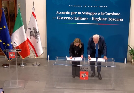 FIRENZE — Un bastimento carico di 683 milioni di euro per 176 progetti di opere strategiche che costruiranno la Toscana di domani: è l'Accordo per Fondo di sviluppo e coesione (Fsc) 2021-2027, firmato questo pomeriggio fra il Governo con la presidente del Consiglio Giorgia Meloni e la Regione Toscana col presidente Eugenio Giani, alla presenza del ministro per gli Affari europei, le Politiche di coesione e il Pnrr, Raffaele Fitto.