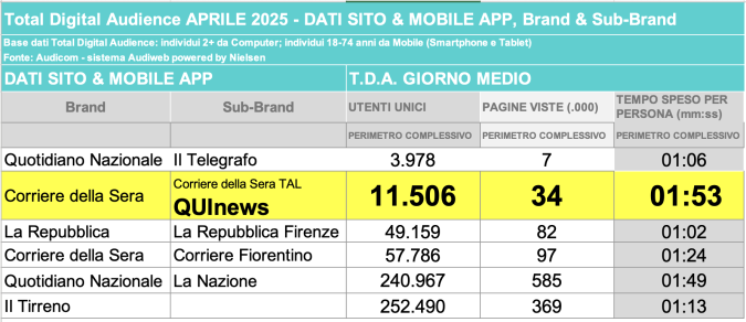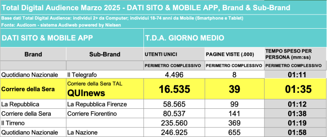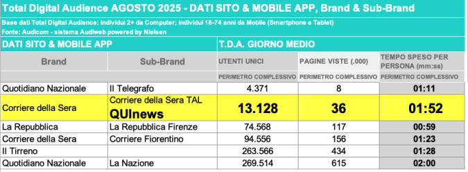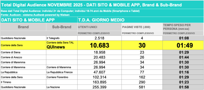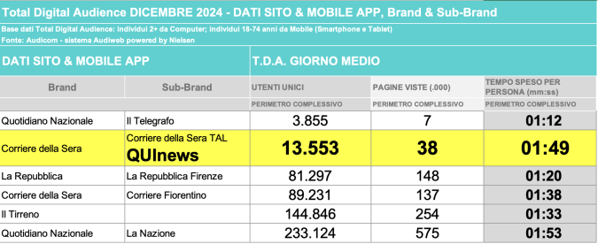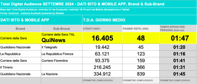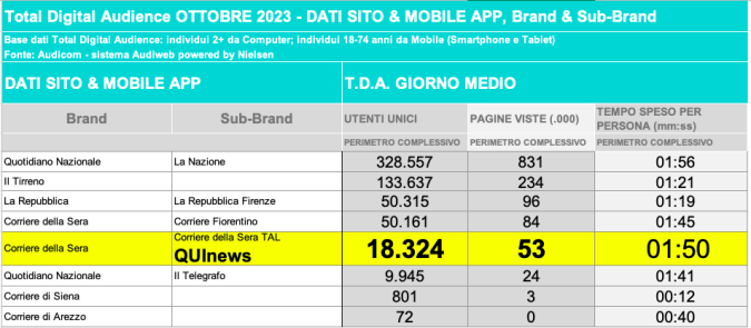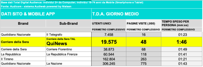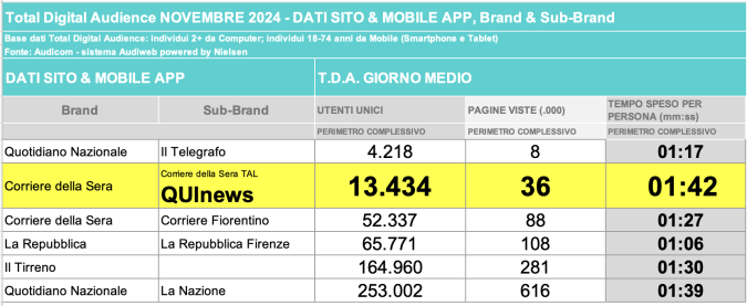 I DATI AUDIWEB DEL MESE DI NOVEMBRE 2020 NON SONO PRESENTI PER ADEGUAMENTO TECNICO DELLA RILEVAZIONE DEL NETWORK QUINEWS COME SUB BRAND DEL CORRIERE DELLA SERA