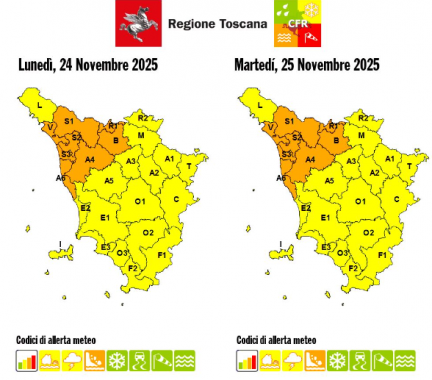 Da stasera fino a domani mattina sarà in vigore anche un'allerta gialla per temporali che interessera la Toscana settentrionale, costa e Arcipelago. Attese precipitazioni diffuse anche a carattere di rovescio o locale temporale, più frequenti sulle zone centro-settentrionali. Tra la sera di oggi e la notte di domani, martedì, fenomeni più sparsi.