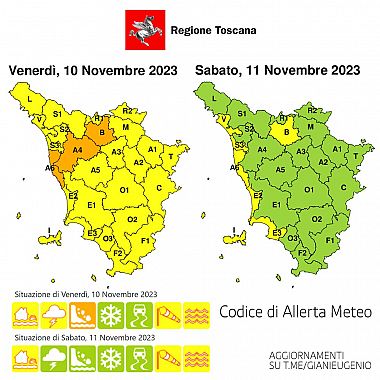 Come prosegue anche l'allerta gialla per rischio idrogeologico e temporali forti sul resto della regione. Rischio idraulico per l’area del Bisenzio e Ombrone pistoiese fino a domani sabato 11 alle 12. Allerta sempre gialla per mareggiate e vento su costa centrale e Arcipelago fino alla giornata di domani sempre alle 12.